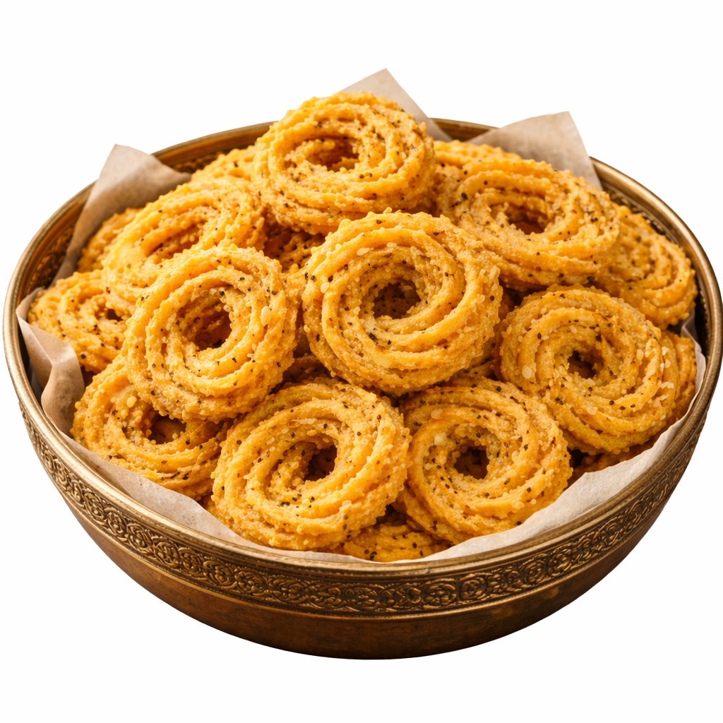 Ingredients: Urad Dal Flour, Rice Flour, Butter, Cumin Seeds, Sesame Seeds, Salt, Oil